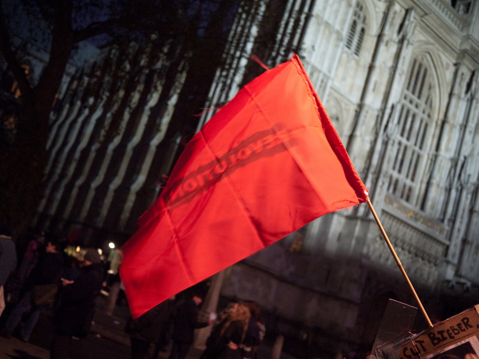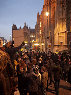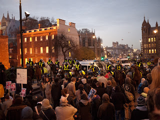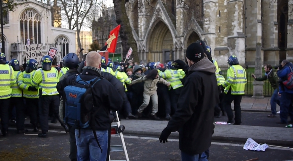 Kad je počela padati noć, mlađi učesnici postali su nervozniji jer im je spriječen prilaz do parlamenta, ispred kojeg je prosvjed najavljen te od policije odobren. Glasanjem su na licu mjesta, ispred policijskog kordona, odlučili da se traži alternativni ulaz do parlamenta. DJ na trokolici sa glasnim razglasom poveo je povorku od nekoliko stotina. Trčali smo u nekoliko navrata, te brzim hodom navigavali uličicama Westminstera.