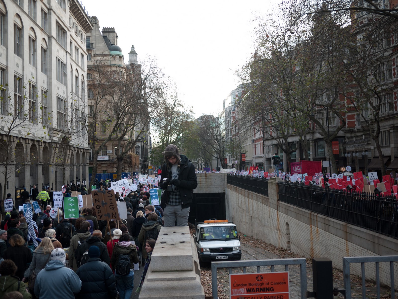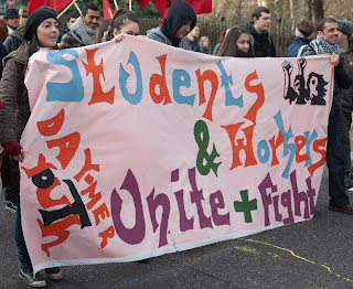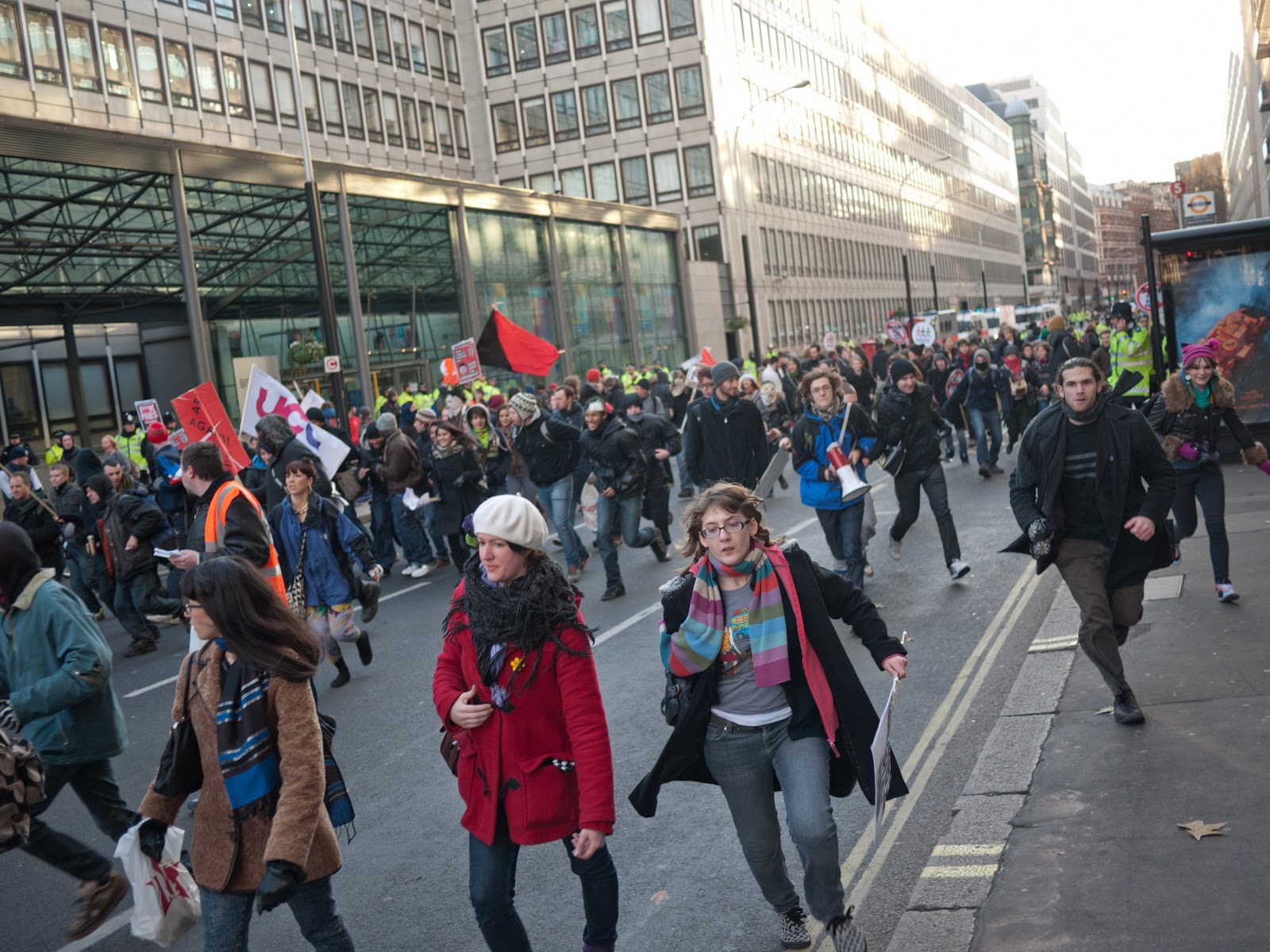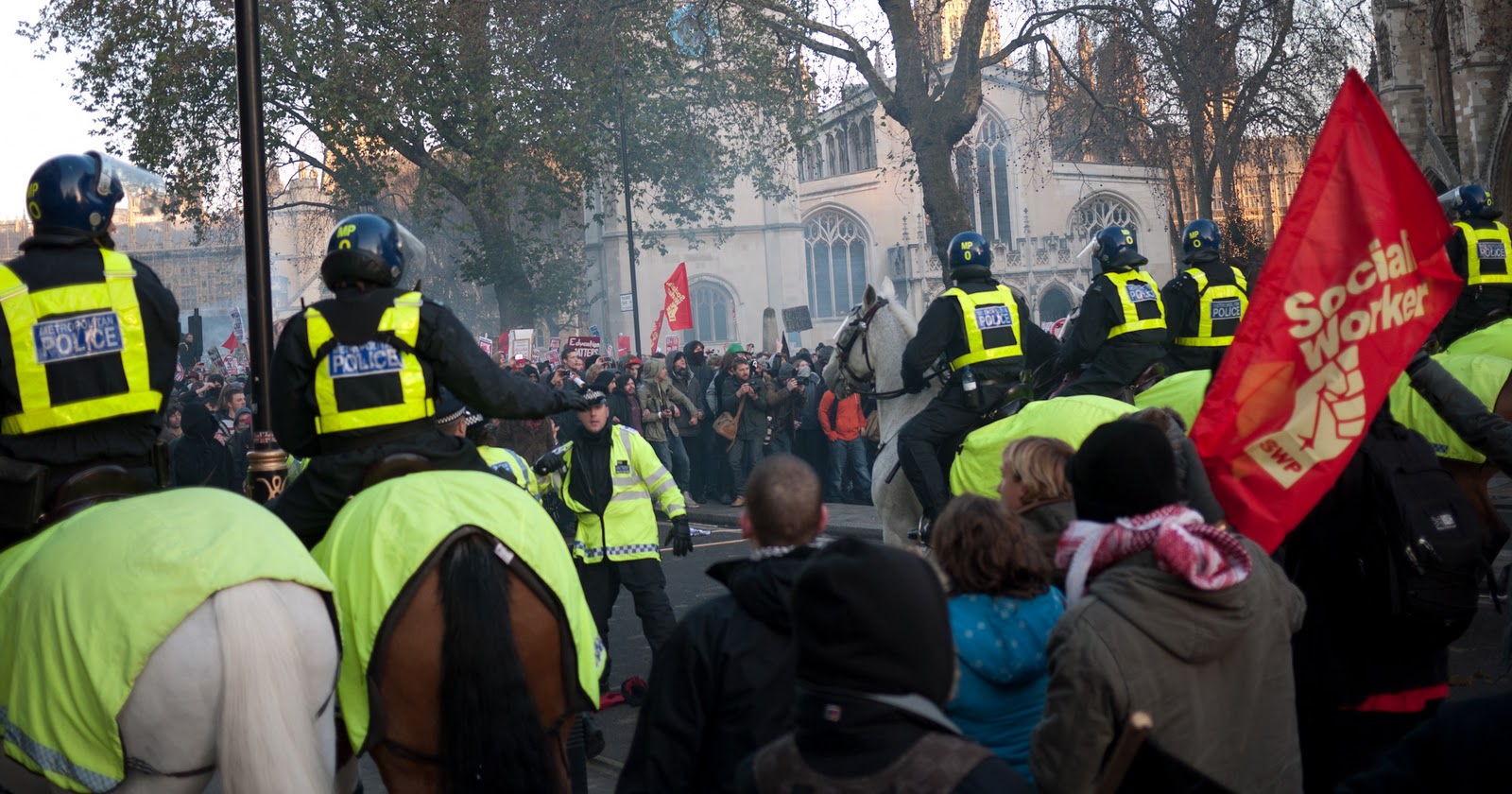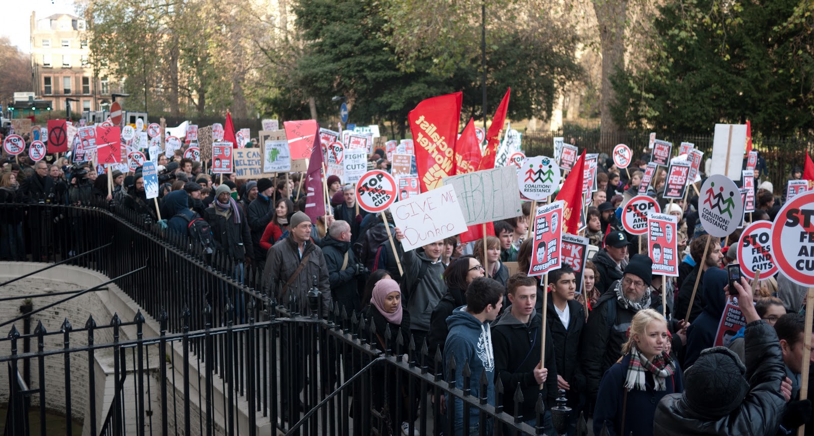 Opći je konsenzus da se ovaj put radi o protestima prepunim srednjoškolaca, mlađih studenata, te rijetko viđenim miješanjem siromašnje mladosti iz londonskih predgrađa sa dotjeranom djecom više srednje klase sa elitnih univerziteta poput Cambridgea i Oxforda. Bio sam svjedok dogovorima ovakvih, inače socijalno sasvim odvojenih, grupa o taktici kako probijati policijske kordone zajedno. Osim ovakvih do sada neviđenih klasnih solidarnosti, londončani u srednjim godinama gotovo su zaboravili kako izgledaju vladavine konzervativaca, dok su studenti tada većinom bili djeca. Cjelokupni nastup policije, a pogotovo ovo zatvaranje na mostu, demonstracije su drugačijeg, militantnijeg pristupa prema vlastitom stanovništvu. Tu nema mjesta za liberalno uljepšavanje stvarnosti, pogotovo ne onakve vrste kakvo je obilježilo vladavinu novih laburista od 1997.