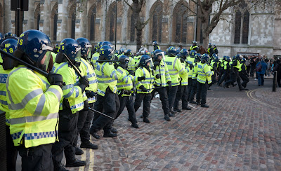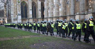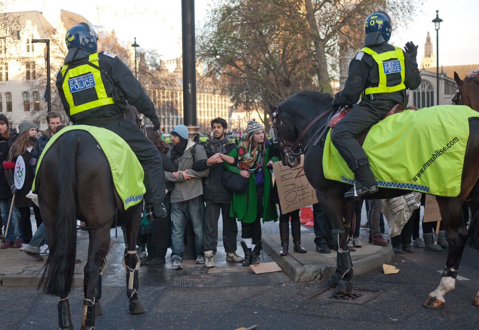 Temperatura je bila malo iznad nule i protest je već satima bio gotov kada je policija lažno obavijestila prosvjednike da mogu napustiti trg ispred parlamenta preko Westimnster mosta. Na mostu su nekoliko tisuća ljudi zatvorili oko 21 sat i tamo ih držali stisnute do poslije 23 sata. Nije bilo prostora ni za sjesti, ljudi su padali od iscrpljenosti, a novine su dan poslije objavljile pisma roditelja u kojima su protestirali zbog policijskog tretmana naglašavajući da su im djeca dolazila kući uplakana i potrešena.