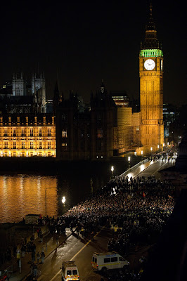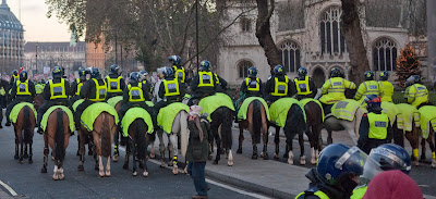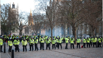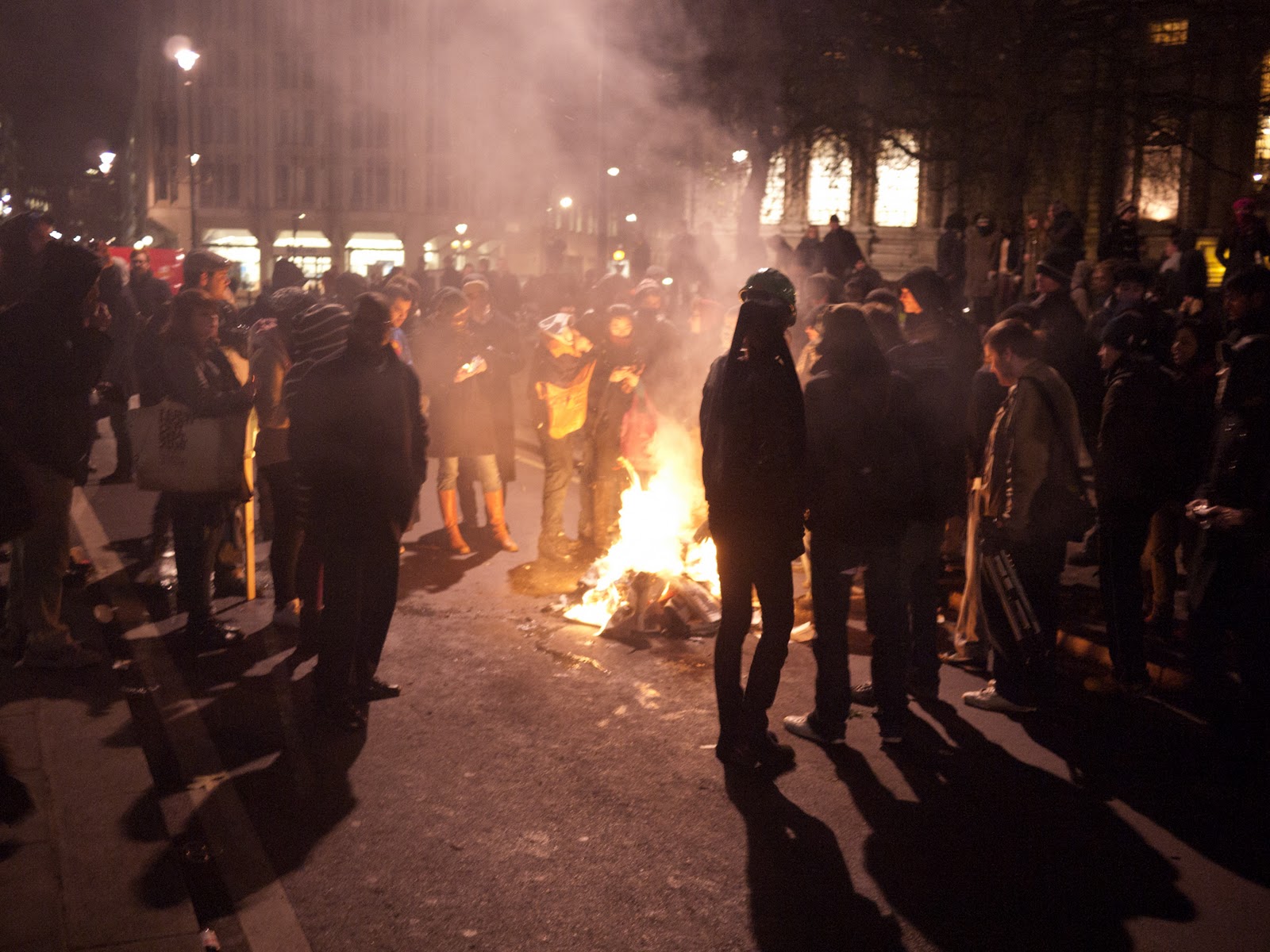 U Londonu je bilo jako hladno, pa su se vatre palile za grijanje, a i iz dosade. Naime, kada policija postavi svoje kordone da bi izolirala glavni prostor demonstracije, ne ostaje baš puno toga smislenog za raditi. Niti možete pronaći društvo s kojim ste stigli, niti vidjeti tko je sve na protestu. Niti se približiti zgradi parlamenta, službenim mjestom odobrenog prosvjeda.