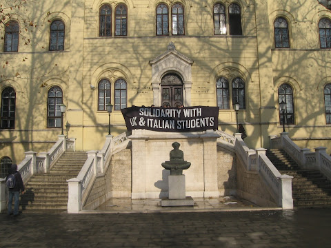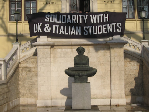 Prošli su tjedan studenti u nekoliko gradova diljem Hrvatske organizirali mini akcije solidarnosti s kolegama u Italiji i Velikoj Britaniji koji se bore protiv povećanja školarina i rezova u obrazovnom sektoru, kako bi još jednom upozorili javnost i akademsku zajednicu na kontinuiranu borbu protiv sve veće komercijalizacije obrazovanja.