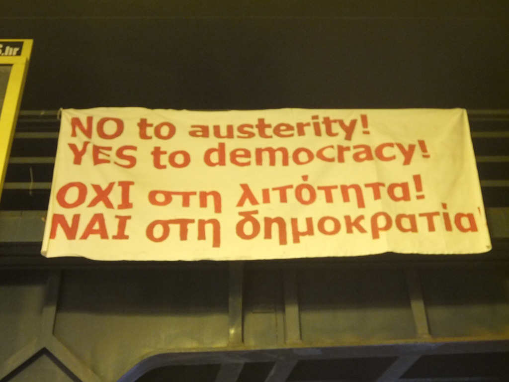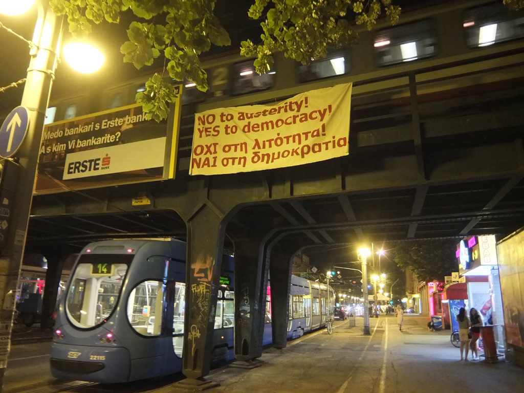 Dva su prosvjeda podrške opciji NE/ΟΧΙ na nedjeljnom grčkom referendumu najavljena za iduća dva dana – Radnička fronta organizira akciju podrške u subotu u 12 sati na Europskom trgu, a u nedjelju u 12 sati na istom mjestu održava se Ulični referendum solidarnosti s građanima i građankama Grčke u organizaciji CMS-a, CROSOL, Matice hrvatskih sindikata, Grupe 22 i CRS-a. U međuvremenu, transparent podrške večeras je izvješen na Savskoj cesti u Zagrebu: “Ususret nedjeljnom referendumu u Grčkoj o mjerama štednje koje Grčkoj pokušavaju nametnuti institucije tzv. Trojke, u petak 3. srpnja oko 23 sata sudionici inicijative “Solidarno s Grčkom – Protiv mjera štednje!” spustili su s nadvožnjaka u Savskoj ulici transparent kojim iskazuju podršku borbi radnog naroda Grčke protiv mjera štednje i diktature kapitala. Slijedi priopćenje na engleskom i hrvatskom povodom ove akcije:”NO to austerity – YES to democracy!, ΟΧΙ στη λιτότητα – ΝΑΙ στη δημοκρατία!We support the struggle of the Greek working people against austerity and the dictatorship of capital. We support your struggle for a real democracy, the one which would work in the interest of the working majority – in Greece and everywhere.A strong and resounding OXI to austerity on the referendum this Sunday can open a broad space for a democratic debate on what kind of Europe the working people want. OXI is a chance to change the balance of forces between work and capital and start a process towards achieving a truly democratic and ecologically sustainable social system. For the benefit of our generation and the generations that come after us.Break with capitalism – fight for democracy!Zagreb (Croatia), 3 July 2015,– solidarity initiative “In Solidarity with Greece – Against Austerity!”